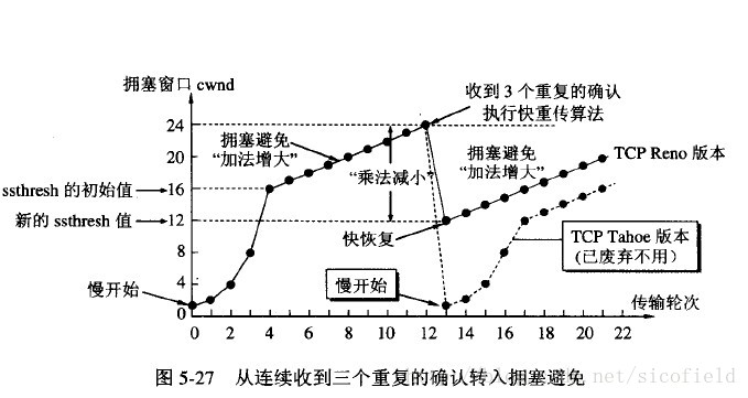 当然收到单个确认但此确认多个数据报的时候就加相应的数值。所以一次传输轮次之后拥塞窗口就加倍。这就是乘法增长,和后面的拥塞避免算法的加法增长比较。
