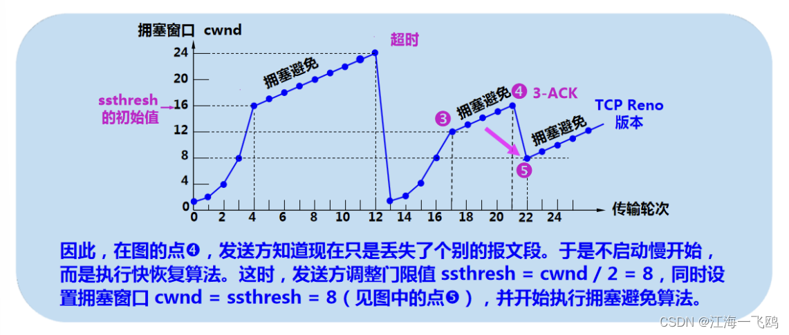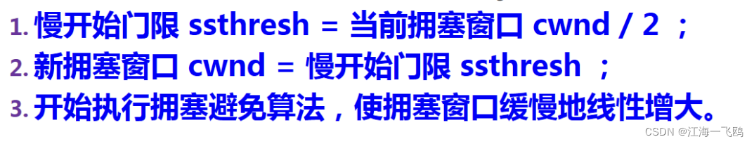 当发送方收到连续三个重复的确认时,由于发送方现在认为网络很可能没有发送拥塞,因此现在不执行慢开始算法,而是执行快恢复算法FR(Fast Recovery)算法: