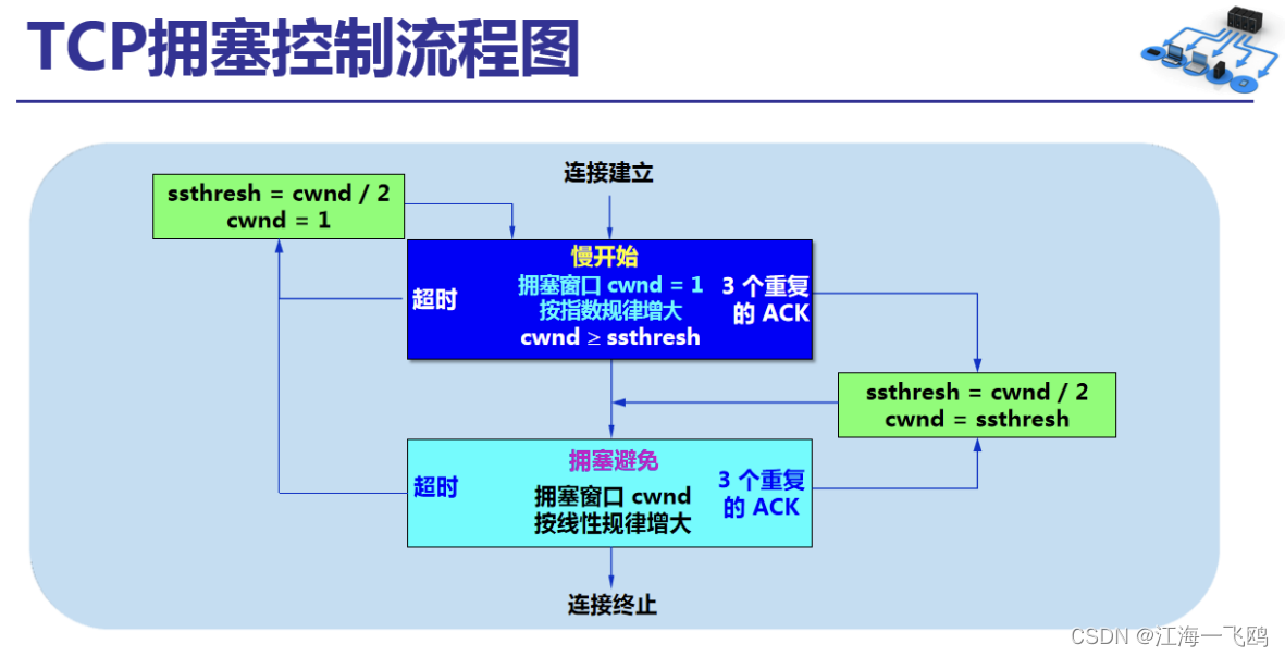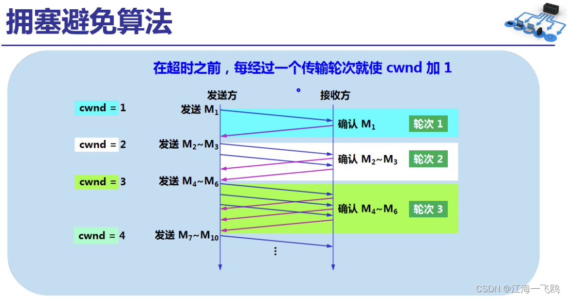 注意:“拥塞避免”并非指完全能够避免了拥塞。利用以上的措施要完全避免网络拥塞还是不可能的。“拥塞避免”是说在拥塞避免阶段把拥塞窗口控制为按线性规律增长,使网络比较不容易出现拥塞。