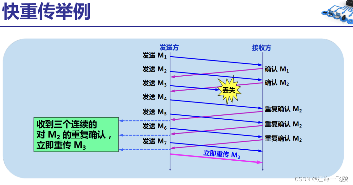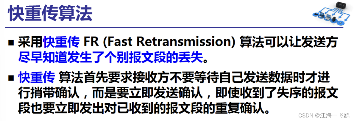 发送方只要一连收到三个重复确认,就知道接收方确实没有收到报文段,因而应当立即进行重传(即“快重传”)这样就不会出现超时,发送方也不就会误以为出现了网络拥塞。