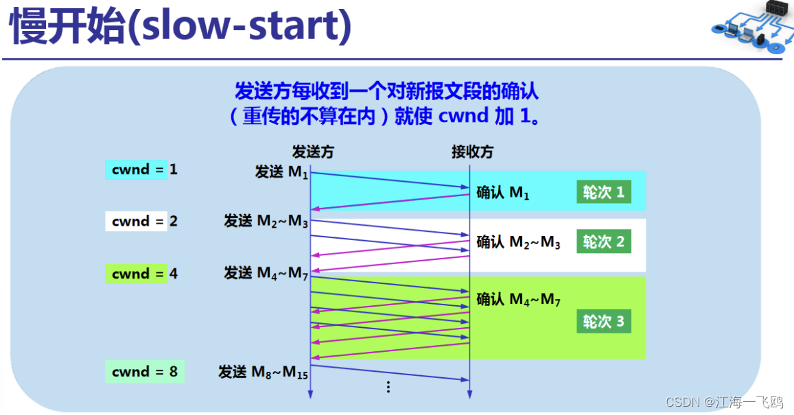 算法思路:由小到大逐渐增大拥塞窗口数值