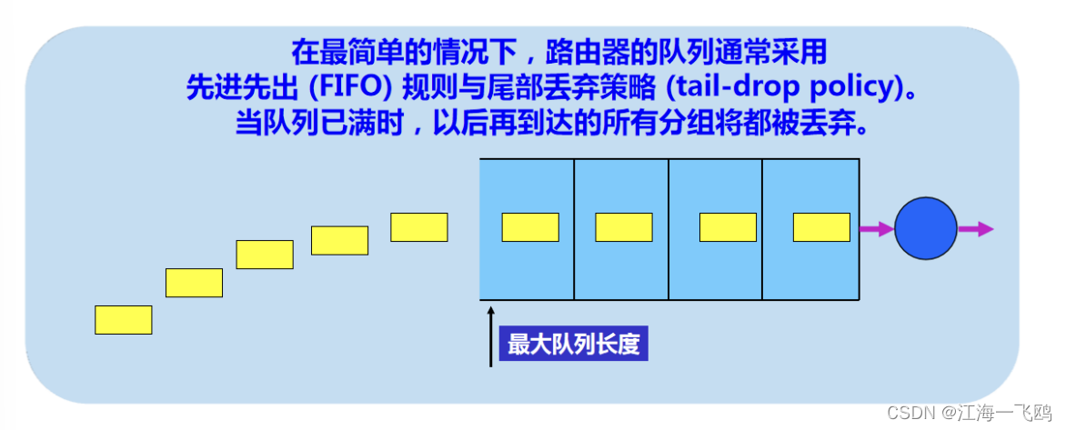 当队列已满时,以后再到达的所有分组(如果能够继续排队,这些分组都将排在队列的尾部)将都被丢弃。这就叫做尾部丢弃策略(tail-drop policy)。