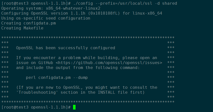 [root@test3 openssl-1.1.1h]# ./config --prefix=/usr/local/ssl -d shared