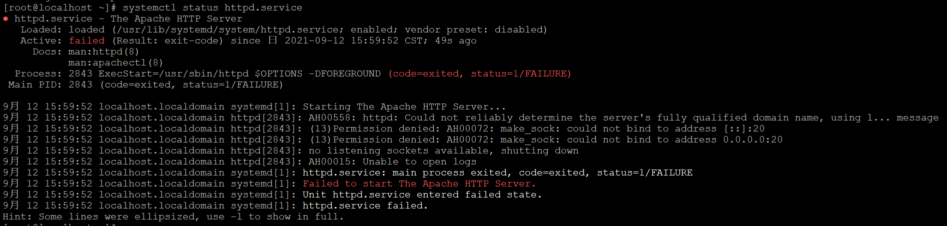 以上就是昏睡麦片最近收集整理的关于Unable to start service httpd: Job for httpd.service failed because the control process exited with的全部内容,更多相关Unable内容请搜索靠谱客的其他文章。