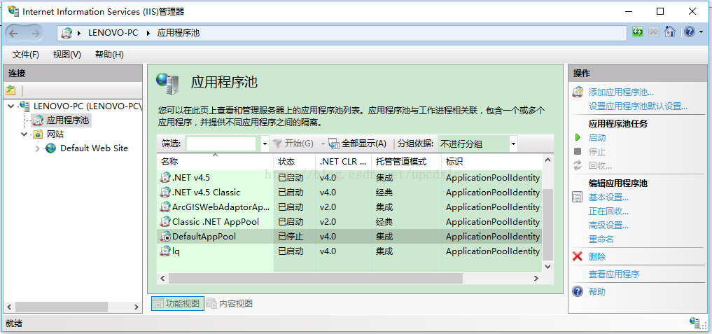 管理工具中打开iis管理器,发现DefaultAppPool未启动