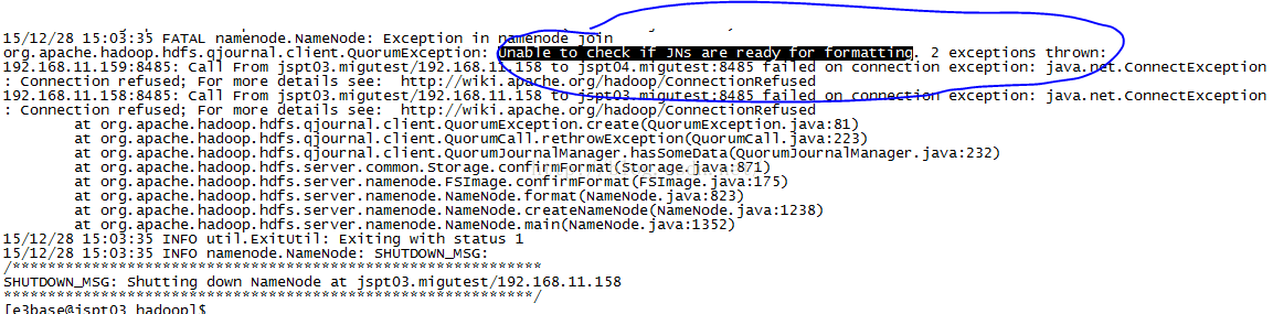 以上就是纯情跳跳糖最近收集整理的关于org.apache.hadoop.hdfs.qjournal.client.QuorumException: Unable to check if JNs are ready for formatt的全部内容,更多相关org.apache.hadoop.hdfs.qjournal.client.QuorumException:内容请搜索靠谱客的其他文章。