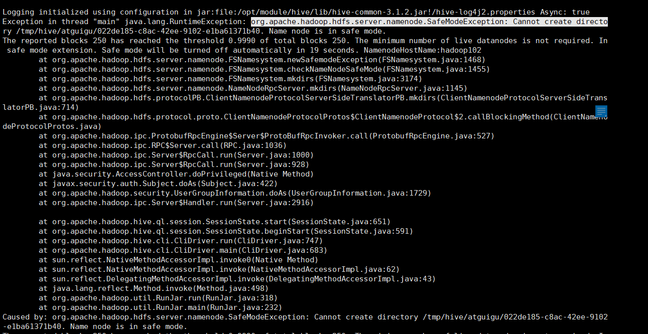 org.apache.hadoop.hdfs.server.namenode.SafeModeException: Cannot create directory /tmp/hive/atguigu/022de185-c8ac-42ee-9102-e1ba61371b40. Name node is in safe mode.
