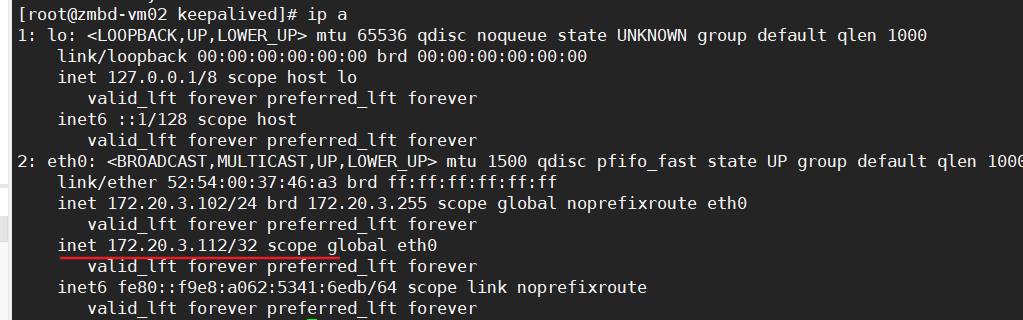 ip a查看keepalived主节点,可以看到虚拟ip在该节点上