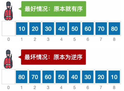 在最好情况下,表中元素已经有序,此时每插入一个元素,都只需比较一次而不用移动元素,总的比较次数达到最小,为n-1。因而时间复杂度为O(n);在最坏情况下,表中元素顺序刚好与排序结果中的元素顺序相反(逆序),总的比较次数达到最大,为 ∑ i = 1 n − 1 i = n ( n − 1 ) 2 sum_{i=1}^{n-1}i=frac{n(n-1)}2 ∑i=1n−1i=2n(n−1),总的移动次数也达到最大,为 ∑ i = 1 n − 1 ( i + 2 ) = ( n − 1 ) ( n − 4 ) 2 sum_{i=1}^{n-1}(i+2)=frac{(n-1)(n-4)}{2} ∑i=1n−1(i+2)=2(n−1)(n−4),时间复杂度为 O ( n 2 ) O(n^2) O(n2);平均情况下,考虑待排序表中元素是随机的,此时可以取上述最好与最坏情况的平均值作为平均情况下的时间复杂度,总的比较次数与总的移动次数均约为 n 2 4 frac{n^2}4 4n2。因此,直接插入排序算法的时间复杂度为 O ( n 2 ) O(n^2) O(n2)。