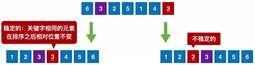 - 需要注意的是,算法是否具有稳定性并不能衡量一个算法的优劣,它主要是对算法的性质进行描述。如果待排序表中的关键字不允许重复,则排序结果是唯一的,那么选择排序算法时的稳定与否就无关紧要。