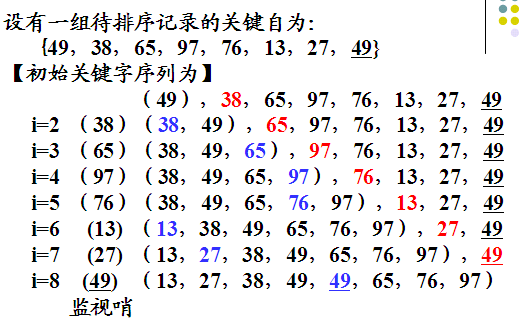 假设将n个待排序的记录顺序存放在长度为n+1的数组R[1]~R[n] 中。R[0]作为辅助空间,用来暂时存储需要插入的记录,起监视哨的作用。该算法是稳定的。
