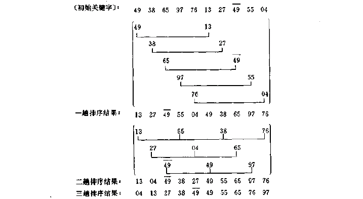 2、稳定排序和不稳定排序:假设Ki=Kj(1≤i≤n,1≤j≤n,i≠j),且在排序前的序列中Ri领先于Rj(即i<j)。若在排序后的排序中Ri仍领先于Rj,即那些具有相同关键字的记录,经过排序后它们的相对次序仍然保持不变,则称这种排序方法是稳定的;反之,若Rj领先于Ri,则称所用的方法是不稳定的。