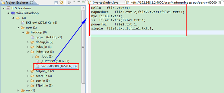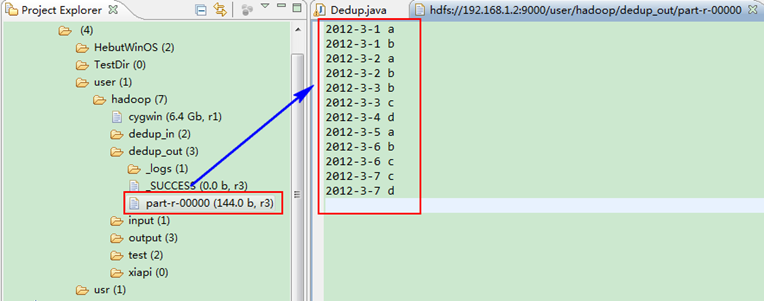 这时我们右击Eclipse的"DFS Locations"中"/user/hadoop"文件夹进行刷新,这时会发现多出一个"dedup_out"文件夹,且里面有3个文件,然后打开双其"part-r-00000"文件,会在Eclipse中间把内容显示出来。如图1.4-4所示。