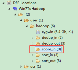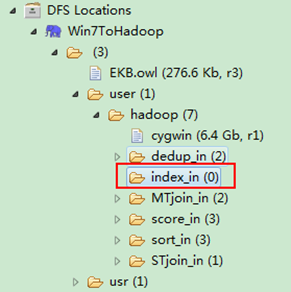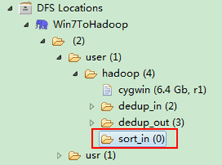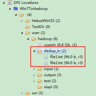 通过Eclipse下面的"DFS Locations"在"/user/hadoop"目录下创建输入文件"dedup_in"文件夹(备注:"dedup_out"不需要创建。)如图1.4-1所示,已经成功创建。