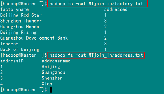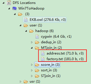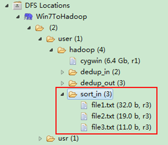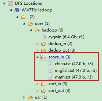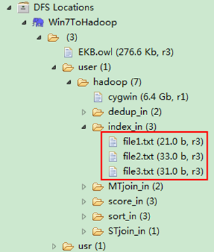 然后在本地建立两个txt文件,通过Eclipse上传到"/user/hadoop/dedup_in"文件夹中,两个txt文件的内容如"实例描述"那两个文件一样。如图1.4-2所示,成功上传之后。