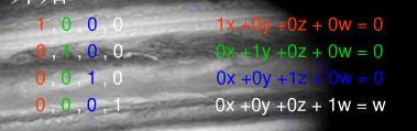 他们的区别在于第四项,向量的第4项取0,可以使矩阵的平移变换失效,而不影响旋转和缩放运算。坐标第4项取1,使平移有效,并且平移变换的比例不会被变化。如果取2,则其平移的距离则是矩阵中定义的2倍。以此类推。注意,在变换后,有可能出现第4项非0/1 的情况,这个时候,我们必须要做一个映射动作,将它从齐次空间映射回3维空间,方法很简单: