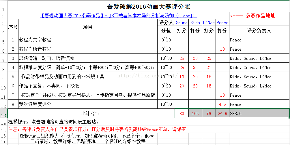 一眼看去还以为是13名,看后面才知道自己得了第二。这已经是超出我的预期了,我对这个结果很是满意。而论坛秉承着公开公正的原则,同时还公布了所有作品的评分细则: