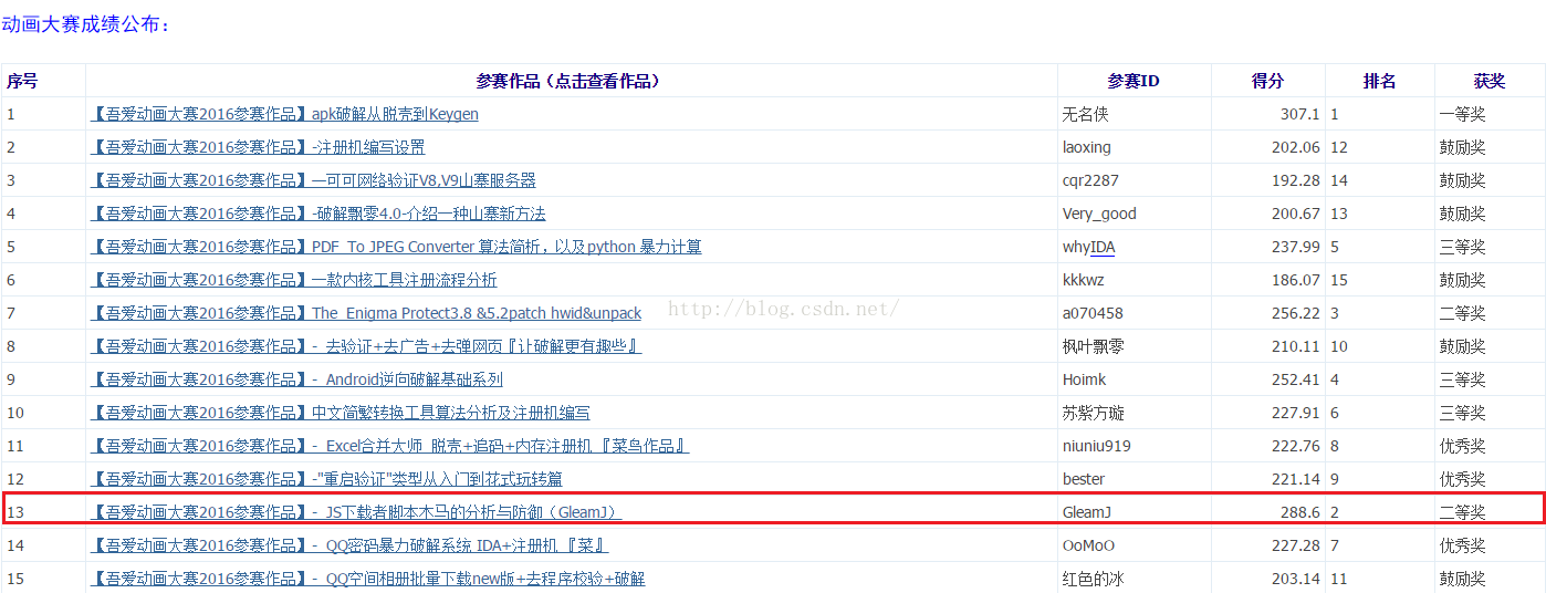 这次的赛事包括我在内,一共有15人参加。其中病毒分析类的只有我自己,安卓逆向破解类的有两人,余下的12个人全都是Windows平台的破解教程。其实我本来打算好好看一下其他14个朋友的参赛作品的,但是正如我上文所说的那样,很多视频在声音方面实在是惨不忍睹,于是我也就不打算继续看下去了。由于我对安卓还是挺感兴趣的,所以把那两个安卓类的教程保存下来了,打算以后好好研究一下。