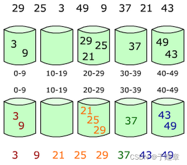 遍历输入数据,并且把数据一个一个放到对应的桶里去;