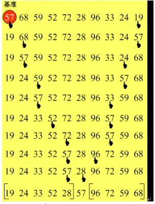1.基本思想:在数组的第一个或最后一个元素里选择一个,作为基准元素,也称中轴。通过排序,让中轴把数组分为俩部分,一部分比中轴小,一部分大。再用递归法同样的排序俩部分。