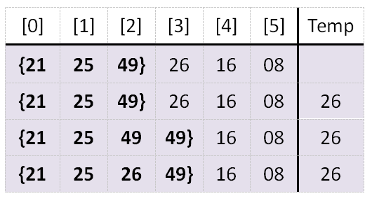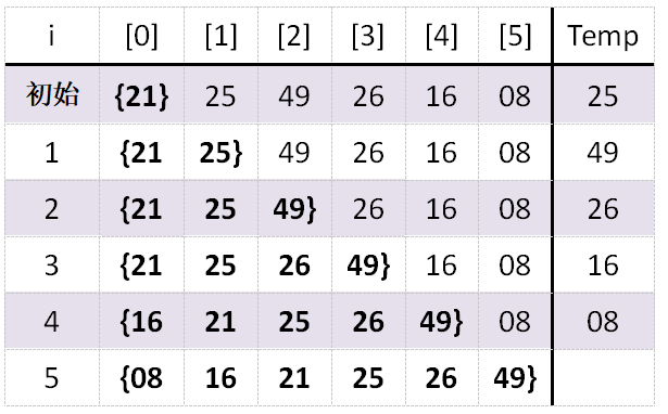 即:当插入第i个元素(i >= 1)时,前面的V[0],V[1],……,V[i-1]已经排好序。这时,用V[i]的排序码与V[i-1],…,V[1],V[0]的排序码顺序进行比较,找到插入位置即将V[i]插入,原来位置上的元素向后顺移。
