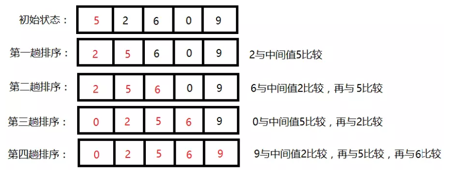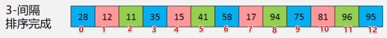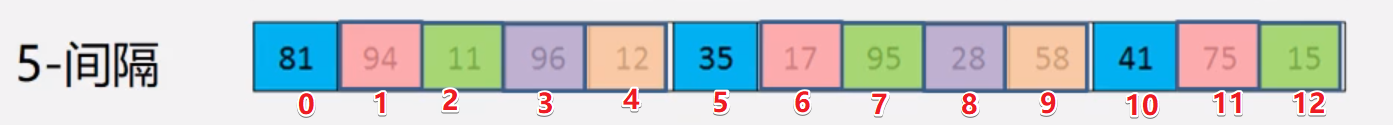 这里要做的事将a[0] ,a[5] ,a[10];a[1] ,a[6] ,a[11] ;a[2] ,a[7] ,a[12];a[3] ,a[8]...这几组数做直接插入排序,注意此时的间隔为5,而不是之前的1,完成后