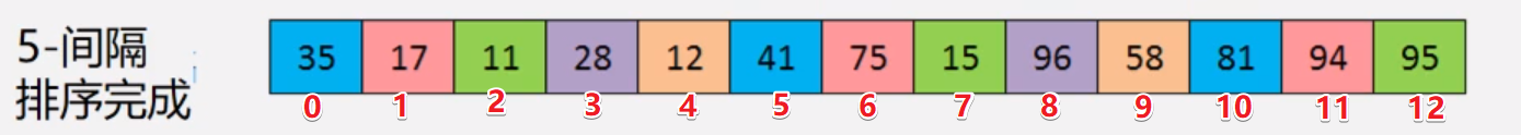 发现规律 ,只要是间隔5的每一组数都是有序的,如{35,41,81},{17,75,91},{11,15,95}都是有序的,这也导致了全部的序列有序性有所提高。