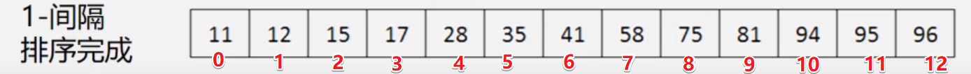 这个时候有序性又提高了不少。最后再将所有的序列做最后一次的直接插入排序,dk = 1的排序。