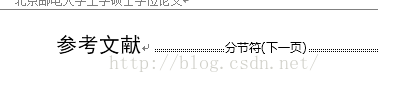 因为尾注的位置是文档的结尾或者是节的结尾,如果我们设置是文档的结尾后,那么后续的致谢和已发表的论文将不能正常的添加,因为参考文献总是最后的;所以参考文献需要选择的是节的结尾,如果从第一章到最后一章算为一个节的话,那么参考文献将会添加到最后一章的结束末尾,但是这个分节符(下一页)添加到哪里呢?如下图所示: