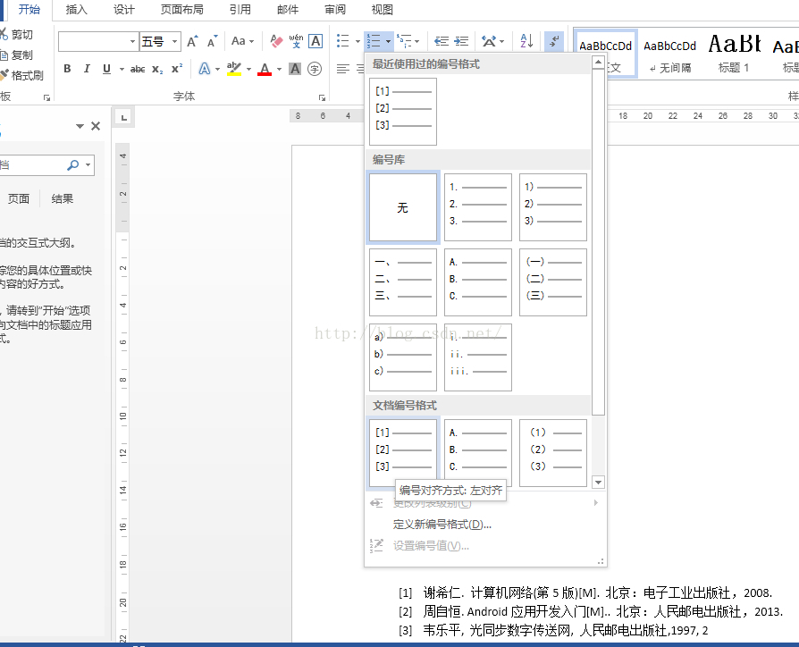 2.选中这些参考文献,然后“开始”---->>>“段落”---->>>“编号”下拉菜单中选择文档编号样式,出现如下: