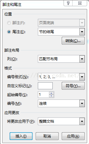 然后设置尾注参数,点击“引用”--->>>"脚注右下方的小箭头",会弹出对话框如下图,按照下图设置即可: