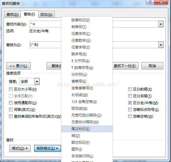 文章各处都引用同一篇参考文献,使用交叉引用(交叉引用时插入的第N(N>2)次上标并不能被替换,此时查找栏中应输入"^#"(代表“特殊格式”中的“任意数字”),此时只能查找到由“交叉引用”产生的上标,第一次插入的上标还是得用"^e"才能查找,这时不管是文章中还是尾注中的参考文献编号都加上了中括号。