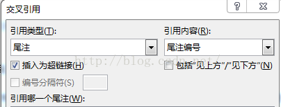 方法:将光标放在论文正文需要插入尾注的地方,点击“插入---->>>链接---->>>交叉引用”,弹出一对话框,在引用类型中选择“尾注”,引用内容为“尾注编号”,这时在菜单中会出现你曾经编写过的所有尾注,选择你需要的,按“插入”按钮即完成交叉引用了。如下图所示: