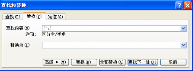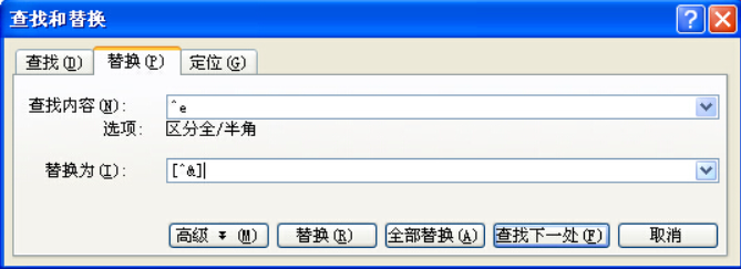 最后Ctrl+H打开替换功能对话框,在全文中添加方括号,查找^e,替换[^&] ,如下图所示