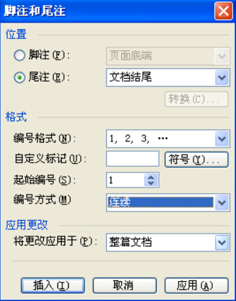 解决这个问题的比较好的办法就是采用尾注。如果你要在某句话的后面加入参考文献,点击插入->引用->脚注和尾注,将弹出的属性对话框按如下图修改:
