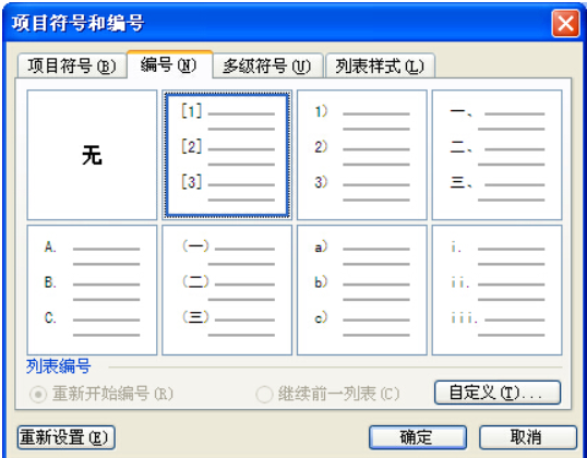 4.全选刚插入进来的参考文献书签文本,点击格式,项目编号和符号,选择参考文献格式的编号[1]——,如果没有点击自定义,自己添加就行了。