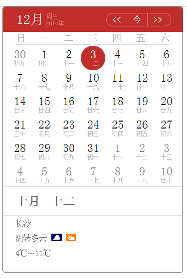 核心内容就是三个部分,公历部分--->script.js,农历部分--->lunar.js,天气部分--->weather.js,尽管日历上加个天气好像看起来不那么恰当,但本来就是练习,就顺便写了。