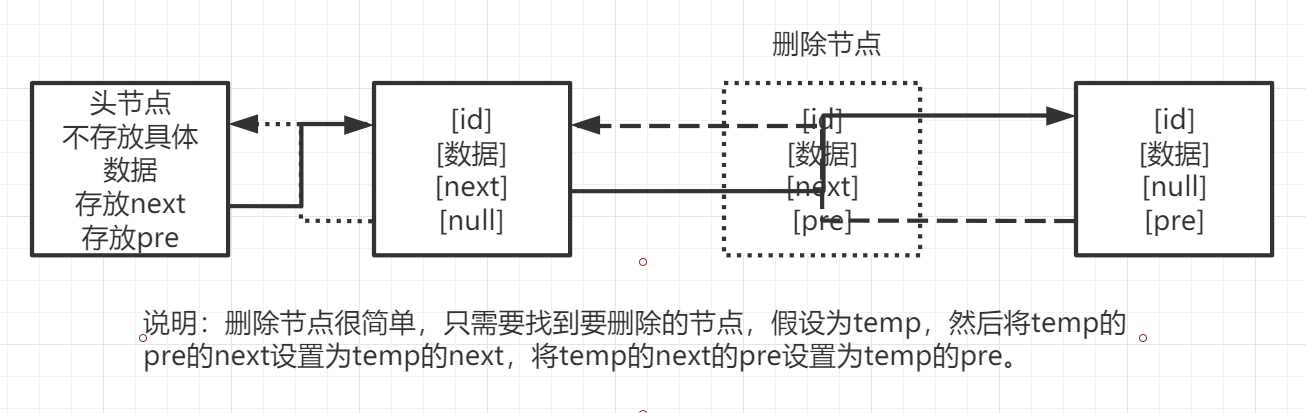(注意:在实际的使用中我们需要灵活,这里给的思路分析是理想状态下的,比如假如要删除的节点是最后一个节点,那么就temp的next为null,temp.next.pre就会报错,所以实际使用的时候需要灵活运用!)
