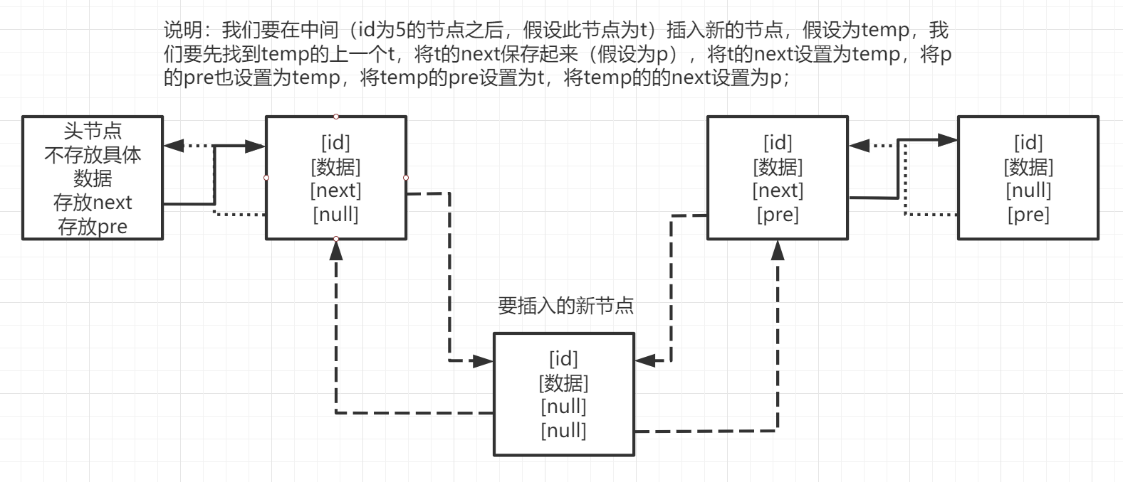 第一步:根据插入位置的条件(比如id),找到要插入位置的前一个节点,假设为t,假设要插入的节点为temp;