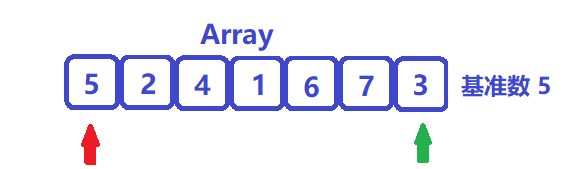 我们假设有一个含有7个元素的int型的一维数组变量,他们分别是5,2,4,1,6,7,3,显然基准数为5,我们要将比5大的放在右边,比5小的放在左边。我们准备两个哨兵指针,分别指向数组的头和尾: