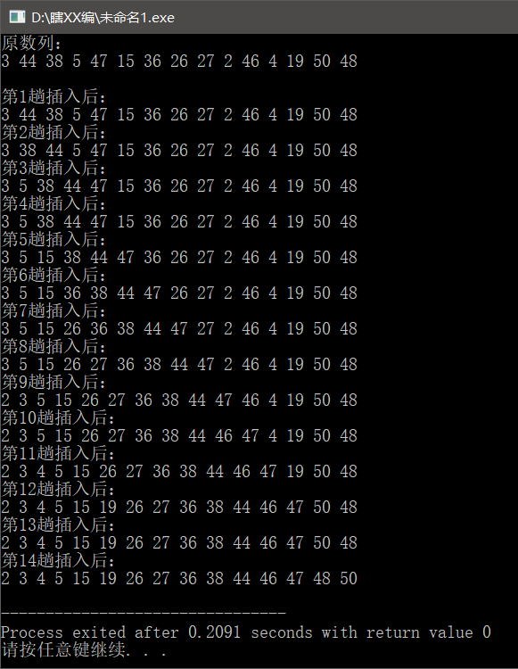 用插入法排序就是,把n个待排序的元素看成为一个有序数列和一个无序数列。开始有序数列中只有一个数,剩余 n-1 个数都在无序数列,然后每次从无序数列中拿出一个数插入到有序数列里,重复 n-1 次。