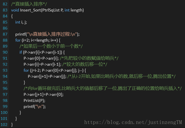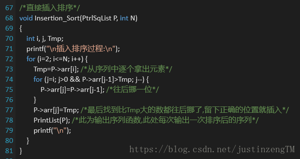 第72行开始,for循环从第二个元素开始拿出来给一个临时变量Tmp保存,然后嵌套一个for循环,因为是与待排序列从后往前比较,所以j从i开始,j>0 && P->arr[ j-1 ]>Tmp(也就是已排好序列中有元素比Tmp大),就把这个较大的元素往后挪一位,直到嵌套的for循环做完后,找到正确的插入位置j了,第77行就把Tmp插入进去。