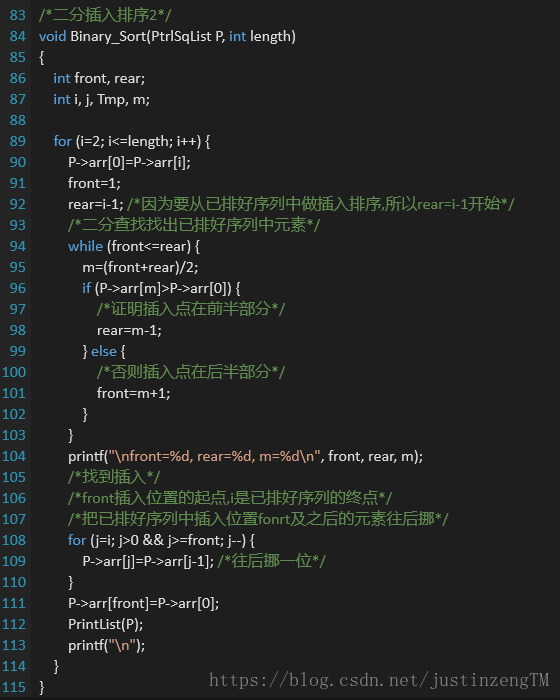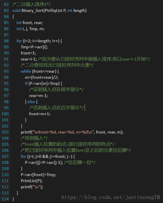 把上面第一种方法改一下,就是通过二分查找找出已排好序列中插入的位置,然后第107行,从插入位置front为起点,已排好序列终点i为终点,把插入位置即后面的元素都往后挪一位,腾出插入位置front来,最后把Tmp插入即可。