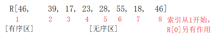 //上面代码执行时,j=0,所以R[0]的值赋给了R[1],即有序区元素位置:R[1]是元素39,R[2]是元素36,无序区元素位置:R[3]元素17,R[4]元素23,R[5]元素28,R[6]元素55,R[7]元素18,R[8]元素46。