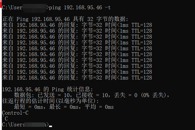 2、-t Ping 指定的计算机直到中断。如:ping 192.168.95.xx -t