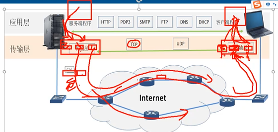 在这幅图中有三个网络,一个用户客户端所在的网络,中间是广域网,第三个是企业idc内部的网络,客户端电脑上发起了一个get请求,tcp将不定长度的http请求切分为tcp认为合适的段,发送到目的的server上,在中间的任意一个节点报文都有可能被丢弃掉,而且路径也可能发生变换,tcp必须保证每个段都可以到达server,server接收到段之后,通常tcp层都是由操作系统的内核实现的,操作系统内核按照相同的顺序丢给了上面的tomcat,处理完之后生产了web页面,通过相同的路径返回给客户端。