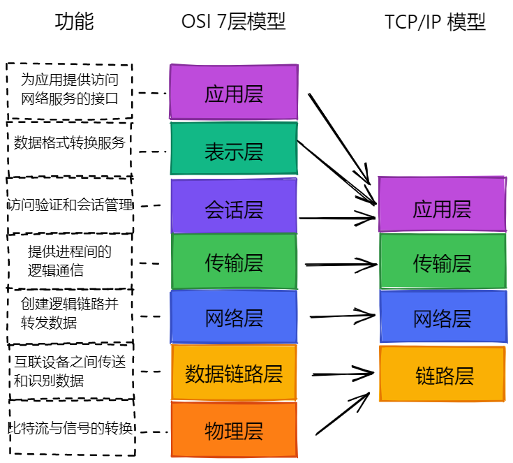 协议族下的各种协议,依其功能不同,分别归属到这四个层次结构之中,常视为是简化的七层OSI模型。
