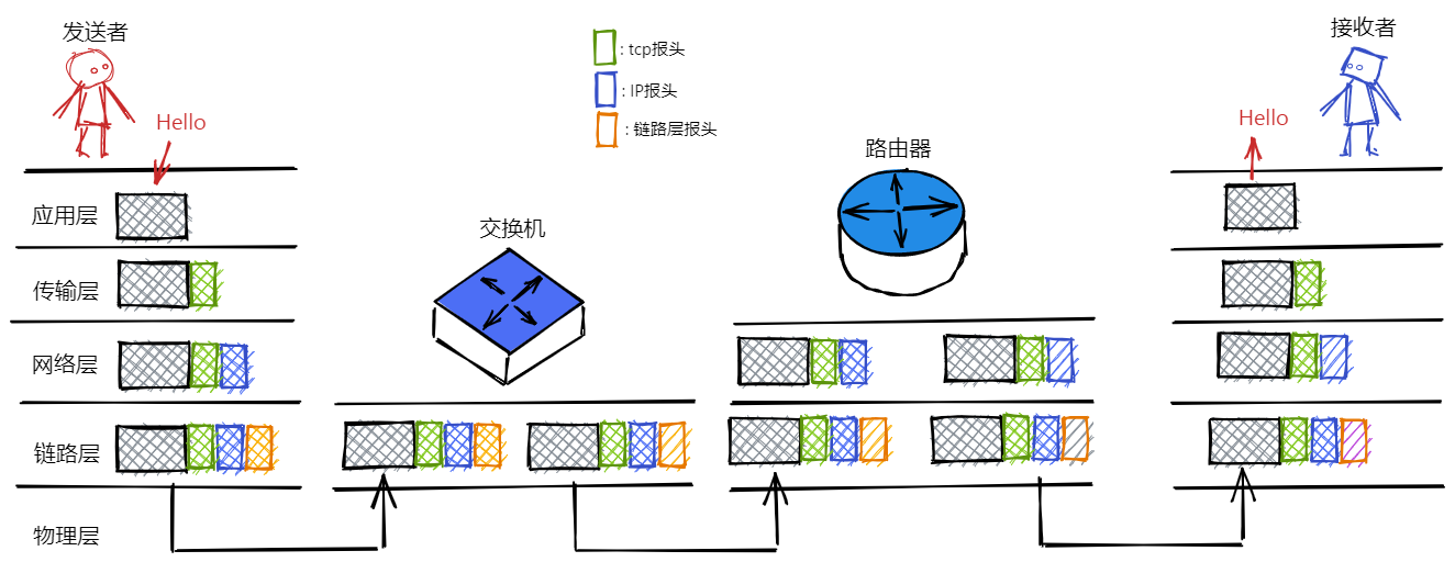 以用户A发送邮件给用户B,发送一条Hello为例子。应用层通过SMTP协议封装数据,然后传输层网络层链路层依次添加报头,进行传输。在网络中传输时,替换掉响应的报头找到下一节点的地址。最终发送给用户B,解码之后收到‘Hello’数据。