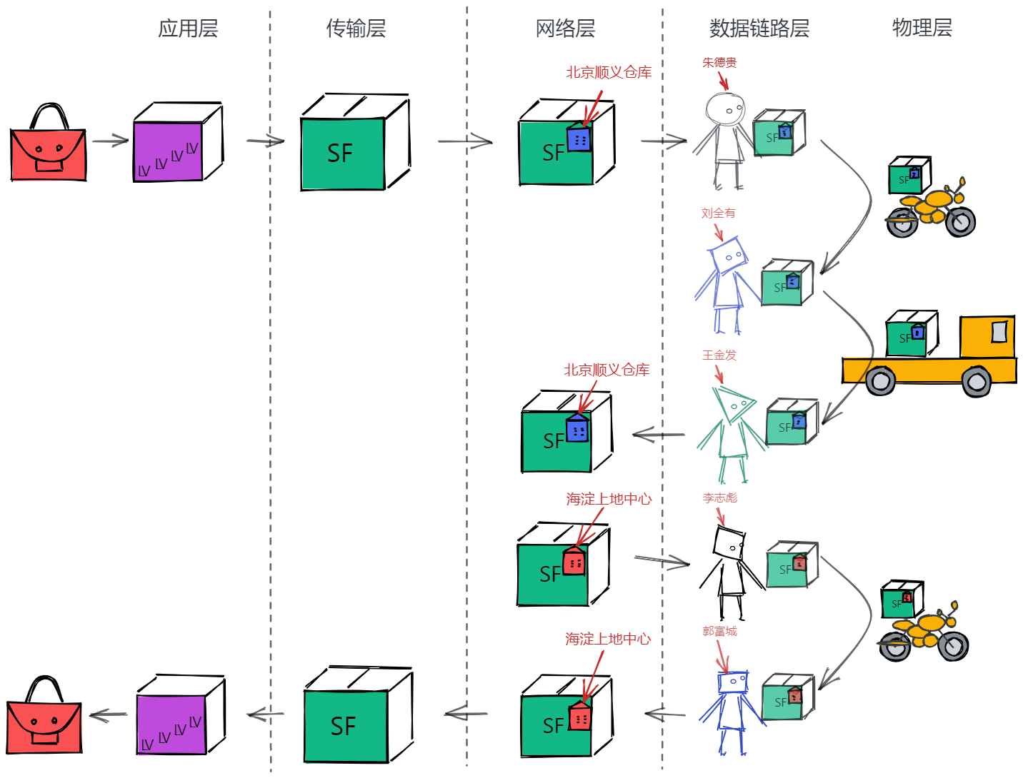 ① 应用层,比如买一个包包,商家会给包打一个包装,这层可以理解为应用层的协议封装,不同的商家可以选择不同的包装方式。