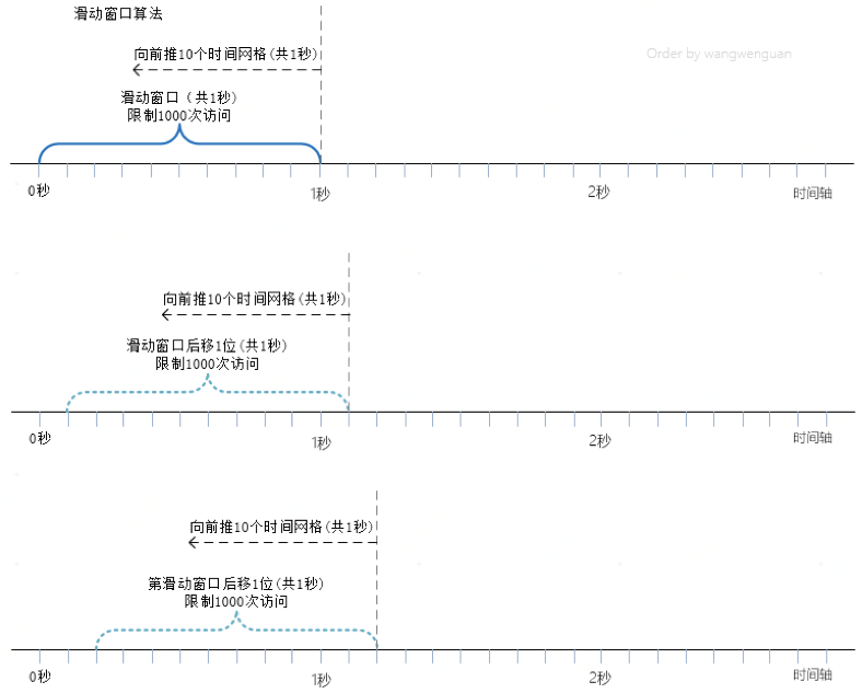 为了解决固定窗口算法的临界问题,我们将其升级为滑动窗口算法。滑动窗口算法实现借鉴滑动窗口协议,将单位时间继续细化为更小粒度的时间网格,每当用户请求,时间网格随之推移,计数器的的统计时间区间也随之变动。滑动窗口算法的单位时间不再是彼此独立,而是步步递进,彼此重叠。这也是滑动窗口算法跟固定窗口算法最大的区别。